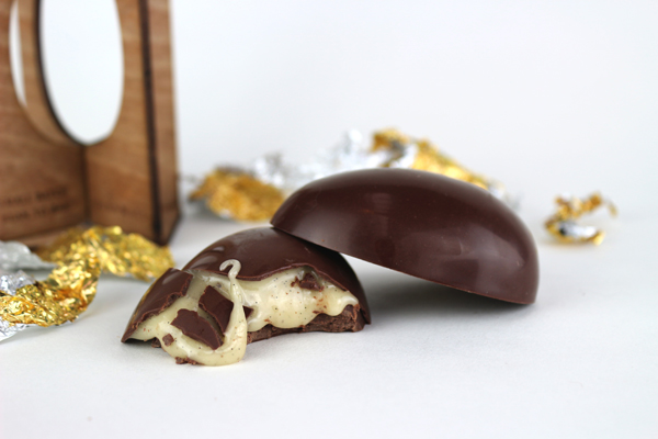 The result is a blend of bitter orange with hints of pine and mango, creating a fondant which fills two half eggs made from Chocolarder’s 55% Chuno milk chocolate.