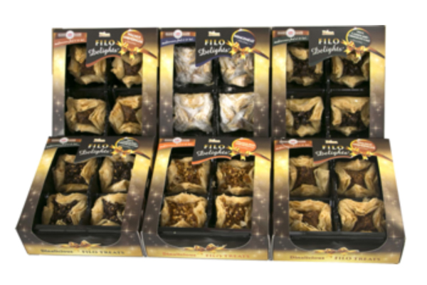 Filo-Delight is a range of four sweet pastries, handcrafted with layer over layer of leaf-thin filo pastry, shaped and filled with specially chosen ingredients such as mint, cashew and chocolate chip, mincemeat, orange zest and almond or walnut and ginger. The variants can be served all year-round, with the mincemeat and chocolate being ideal for the festive period.