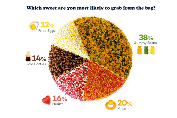 In a 190g bag of HARIBO Starmix, you have the highest chance of grabbing a gummy bear- as they make up 38% of the bag. There’s a one in five (20%) chance of picking out a ring, a 16% chance of snatching a heart and 14% chance of choosing a cola bottle. That just leaves the foamy fried egg, which you have a one in eight (12%) chance of picking out of a pack.