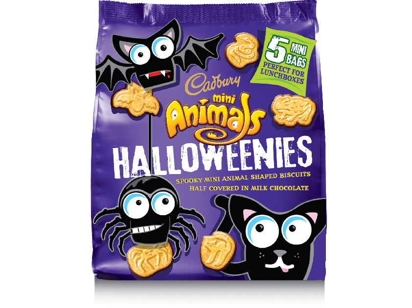 Cadbury Mini Animals Halloweenies – 5 x mini bags of spooky mini animal-shaped biscuits half-covered in Cadbury Milk Chocolate.