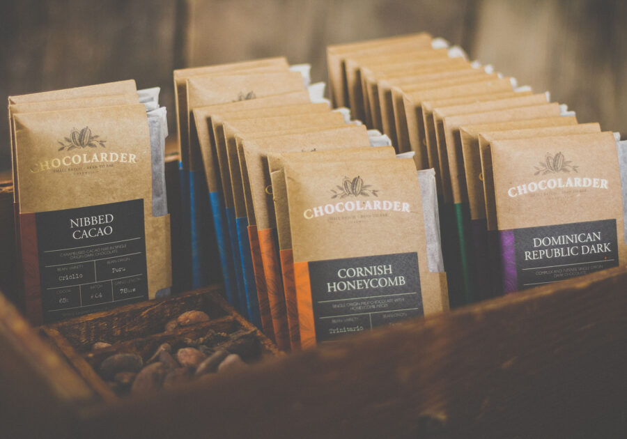 Chocolarder produces authentic bean-to-bar chocolate using local granite to grind beans imported from family run plantations from Venezuela, Java, Madagascar, Peru and the Dominican Republic. Locally sourced ingredients are used to flavour the chocolate, such as handpicked gorse from the tops of cliffs overlooking Kynance Cove.