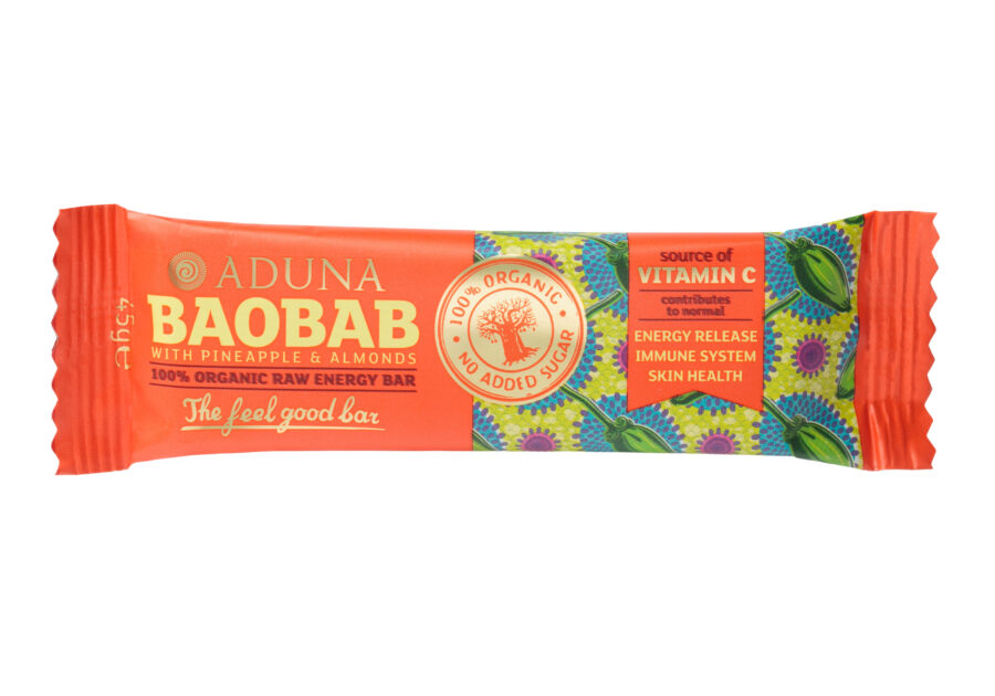 Eve Kalinik, nutritional therapist, comments: ‘The Aduna Baobab Raw Energy Bar contains a whopping two full teaspoons (5.5g) of this vibrant superfruit, providing a decent shot of your daily intake of vitamin C – a core nutrient that we can often find ourselves lacking in due to stress. Vitamin C is essential for a healthy immune system and to keep you pepped up through the day as well as giving glowing, radiant skin. The bar is an ideal way to add baobab into your routine or simply enjoy a guilt-free snack while on the run’.